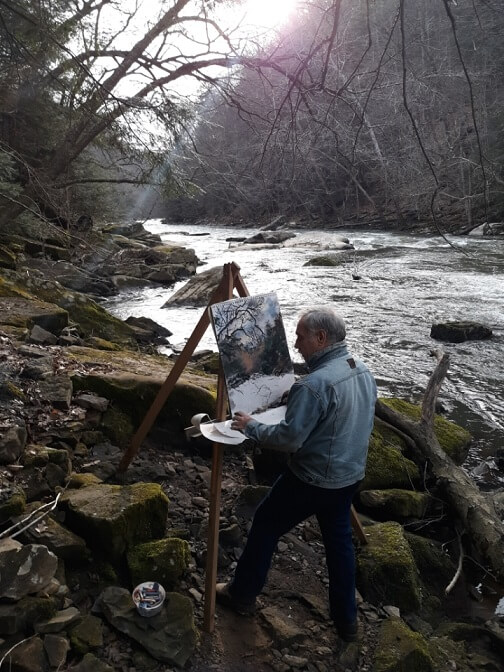 His focus is on creation – mainly landscapes. He always paints from life, en Plein air. The bulk of his work is nature landscapes, but he will deviate from this subject matter from time to time. Both the Pacific Northwest and his current surroundings in Western Pennsylvania influence his work.